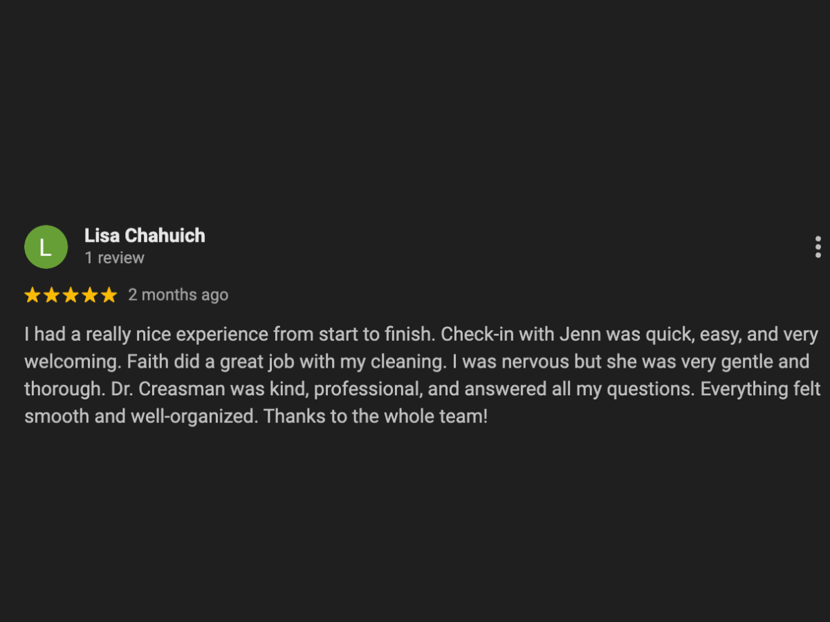 I had a really nice experience from start to finish. Check-in with Jenn was quick, easy, and very welcoming. Faith did a great job with my cleaning. I was nervous but she was very gentle and thorough. Dr. Creasman was kind, professional, and answered all my questions. Everything felt smooth and well-organized. Thanks to the whole team! - Lisa Chahuich