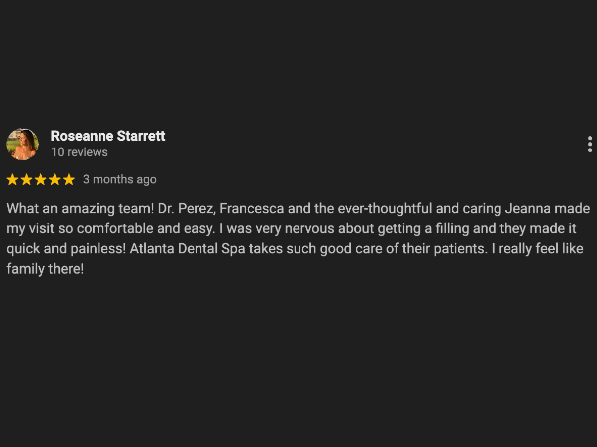 What an amazing team! Dr. Perez, Francesca and the ever-thoughtful and caring Jeanna made my visit so comfortable and easy. I was very nervous about getting a filling and they made it quick and painless! Atlanta Dental Spa takes such good care of their patients. I really feel like family there! - Roseanne Starrett