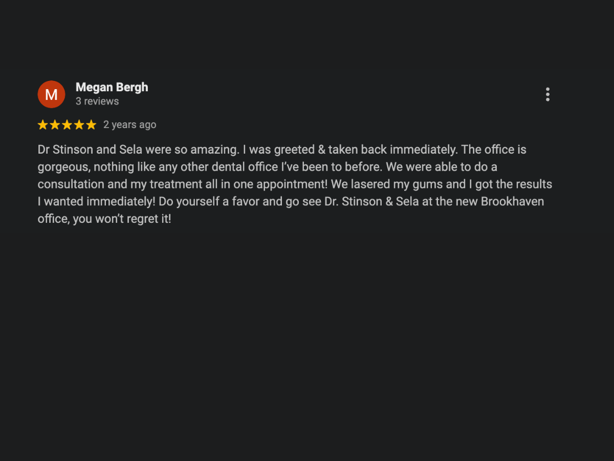 Dr Stinson and Sela were so amazing. I was greeted & taken back immediately. The office is gorgeous, nothing like any other dental office I’ve been to before. We were able to do a consultation and my treatment all in one appointment! We lasered my gums and I got the results I wanted immediately! Do yourself a favor and go see Dr. Stinson & Sela at the new Brookhaven office, you won’t regret it! - Megan Bergh