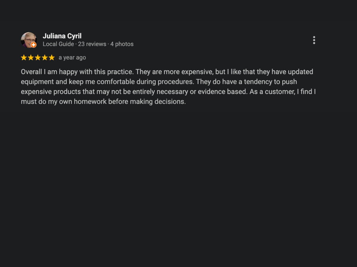 Overall I am happy with this practice. They are more expensive, but I like that they have updated equipment and keep me comfortable during procedures. They do have a tendency to push expensive products that may not be entirely necessary or evidence based. As a customer, I find I must do my own homework before making decisions. - Juliana Cyril