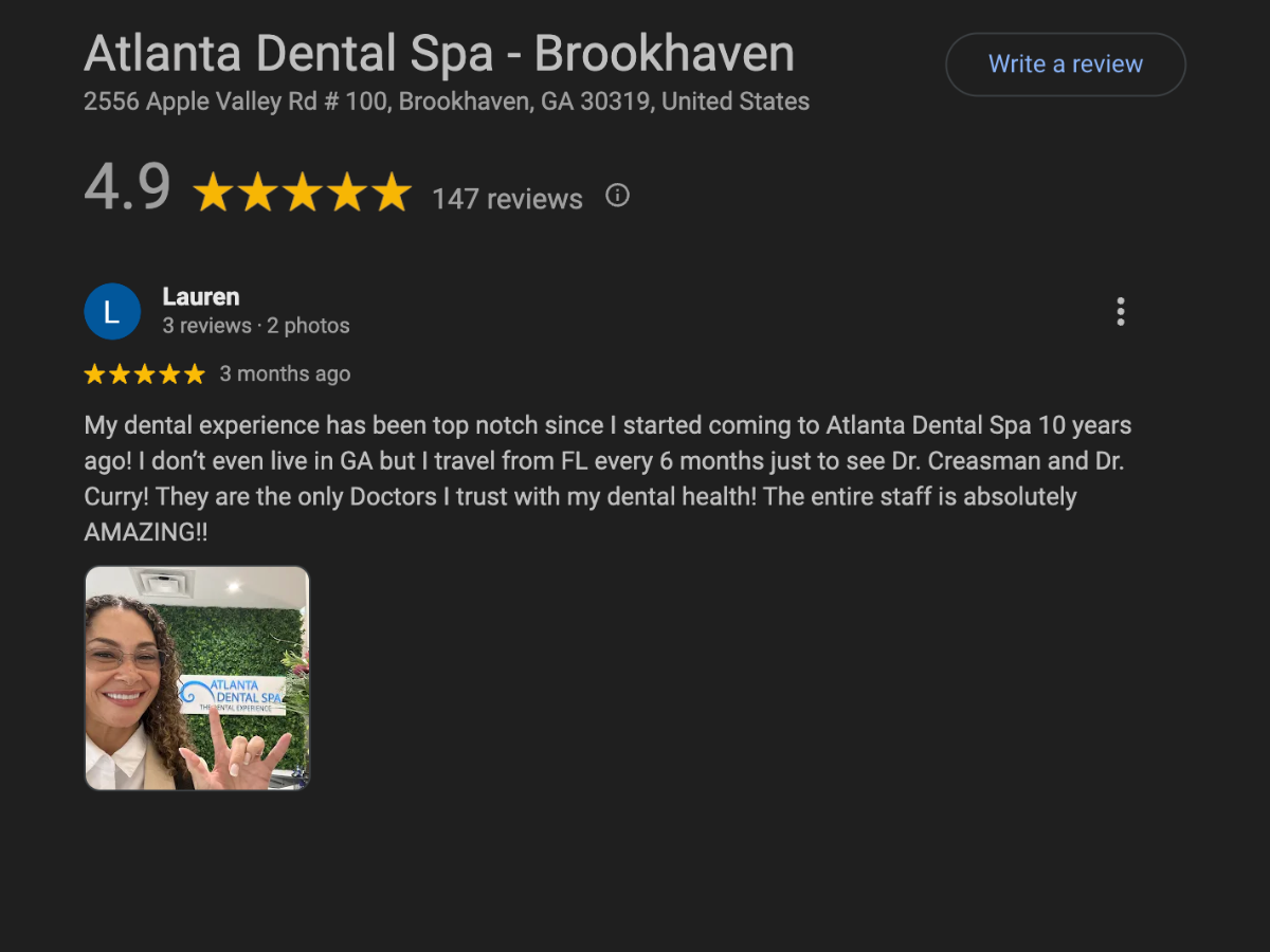 My dental experience has been top notch since I started coming to Atlanta Dental Spa 10 years ago! I don’t even live in GA but I travel from FL every 6 months just to see Dr. Creasman and Dr. Curry! They are the only Doctors I trust with my dental health! The entire staff is absolutely AMAZING!! - Lauren